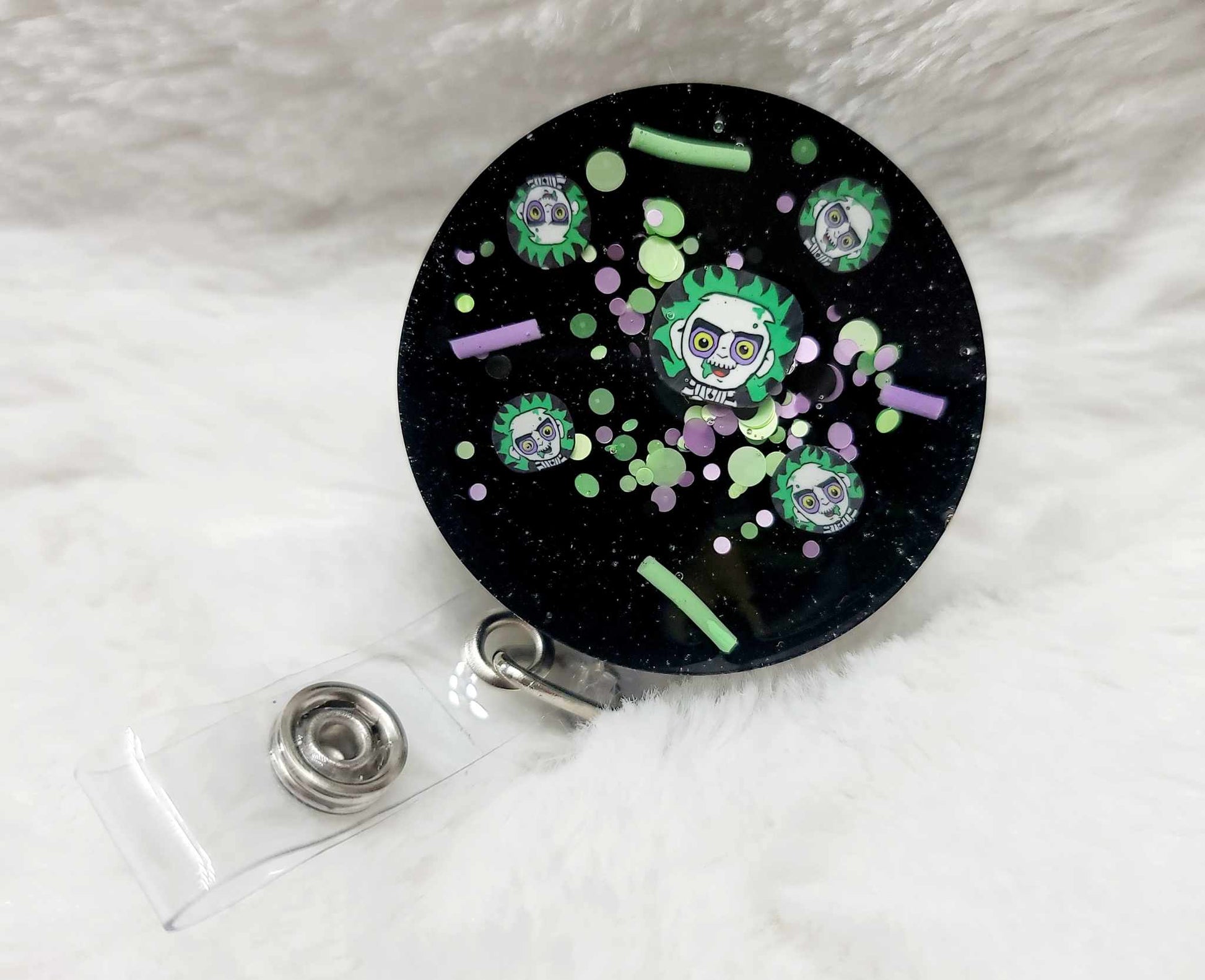 This is a handmade badge reel. This a festive piece for the Halloween season. This has a rotating claw clamp on the back.