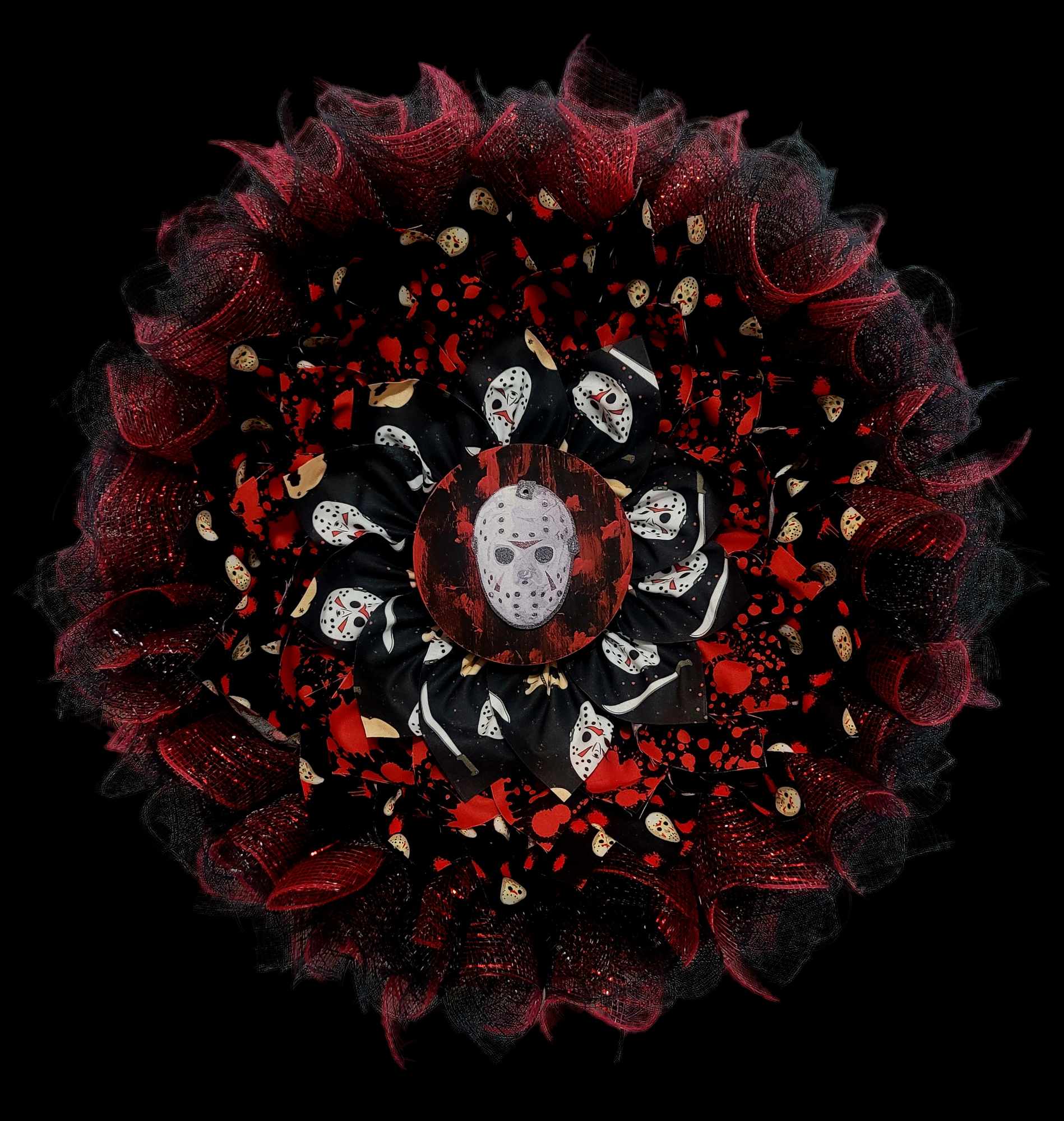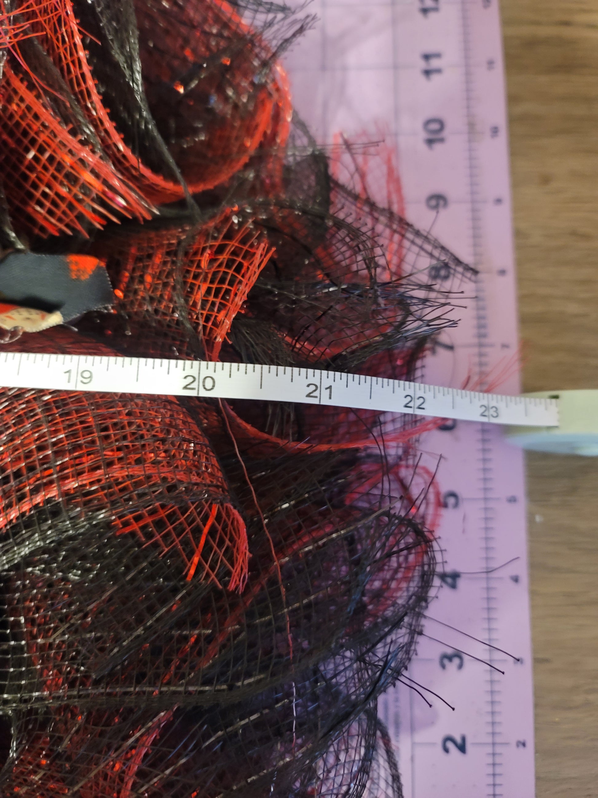 This is a handmade wreath. This is made from Cotten fabric that has been pressed, strategically measured and cut and pressed again. The Deco mesh is measured, cut and folded. And all the pieces are assembled together in a sturdy and durable manner. This is 22 inches wide as well as tall.