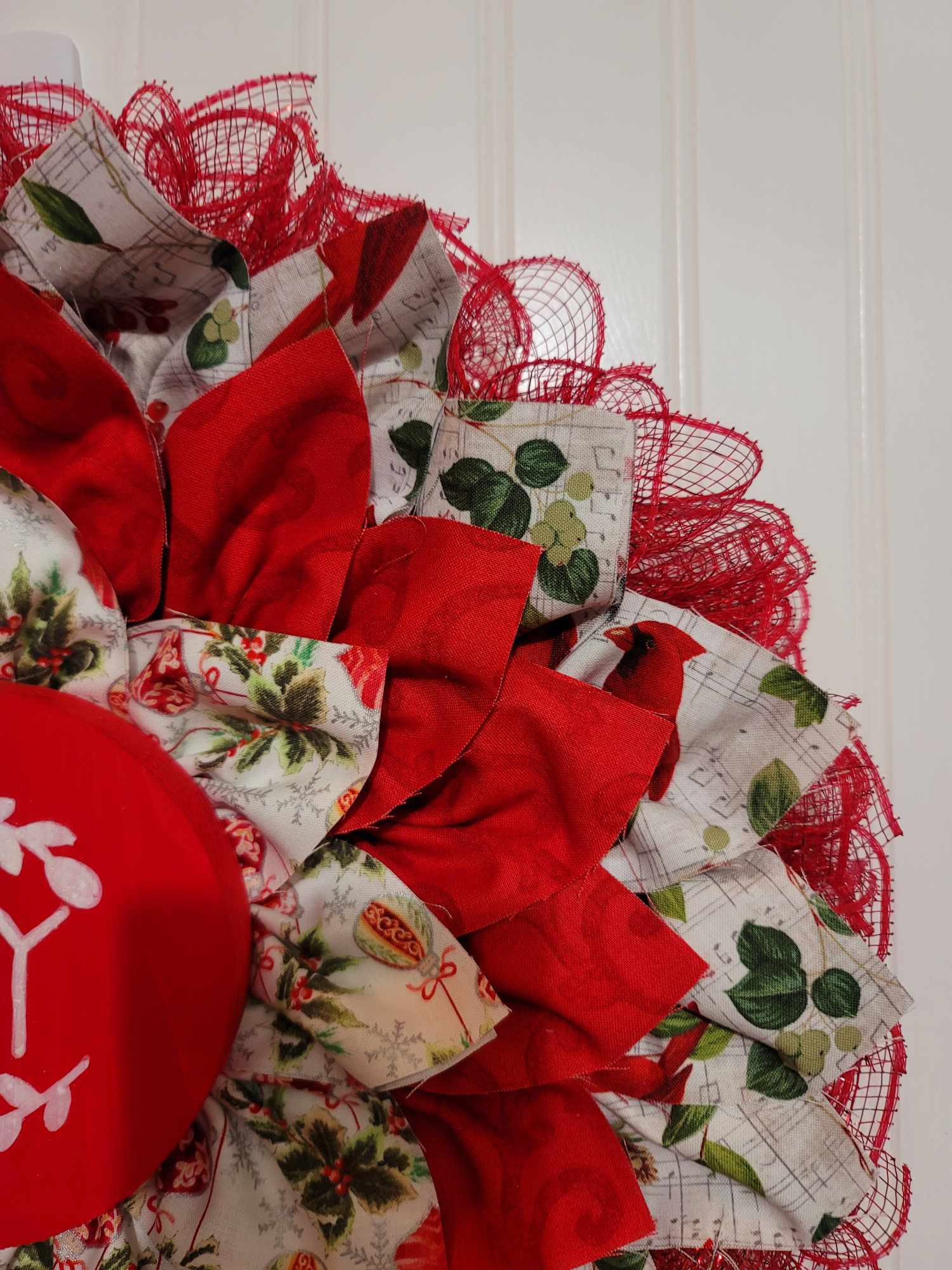 This is a handmade fabric wreath. This is a Christmas themed wreath.