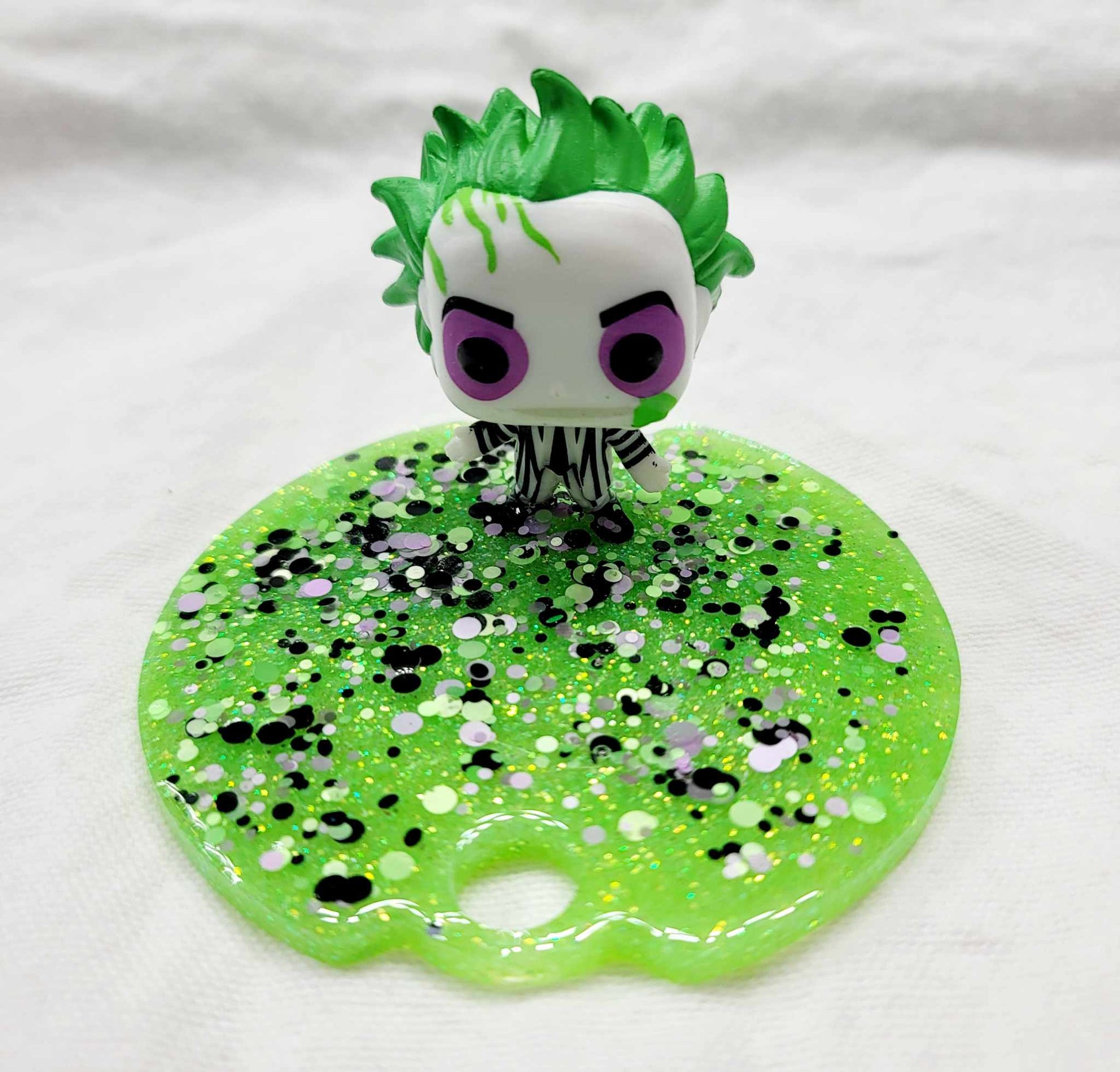 This is a handmade lid cover. This is not only glittery but it also GLOWS IN THE DARK!! this is a perfect accent piece for spooky season. This is made specifically to fit your Stanley style tumbler.