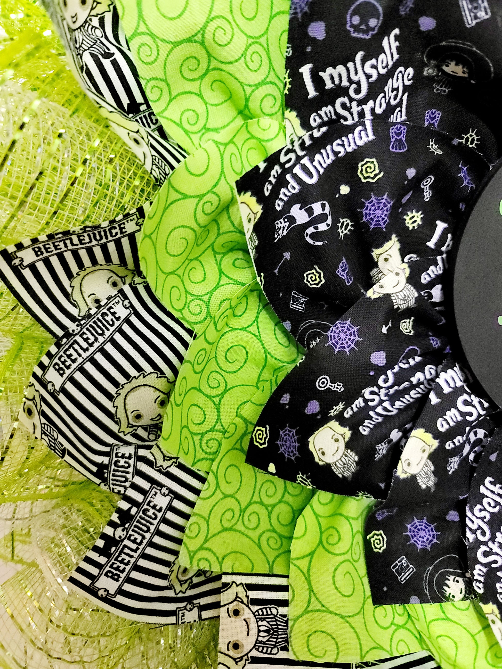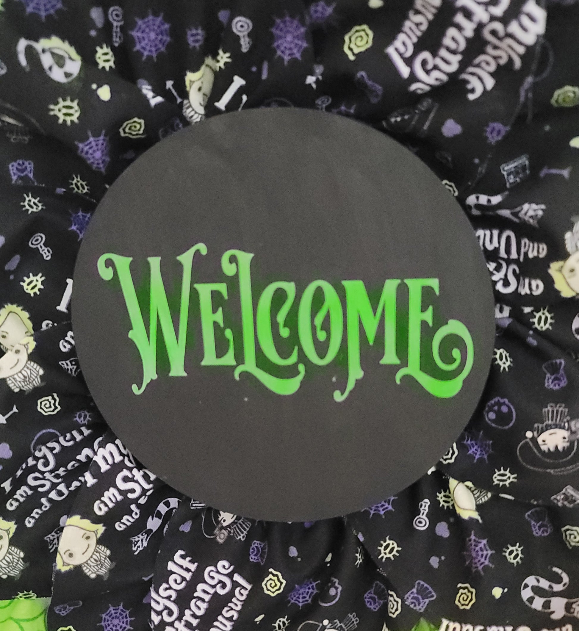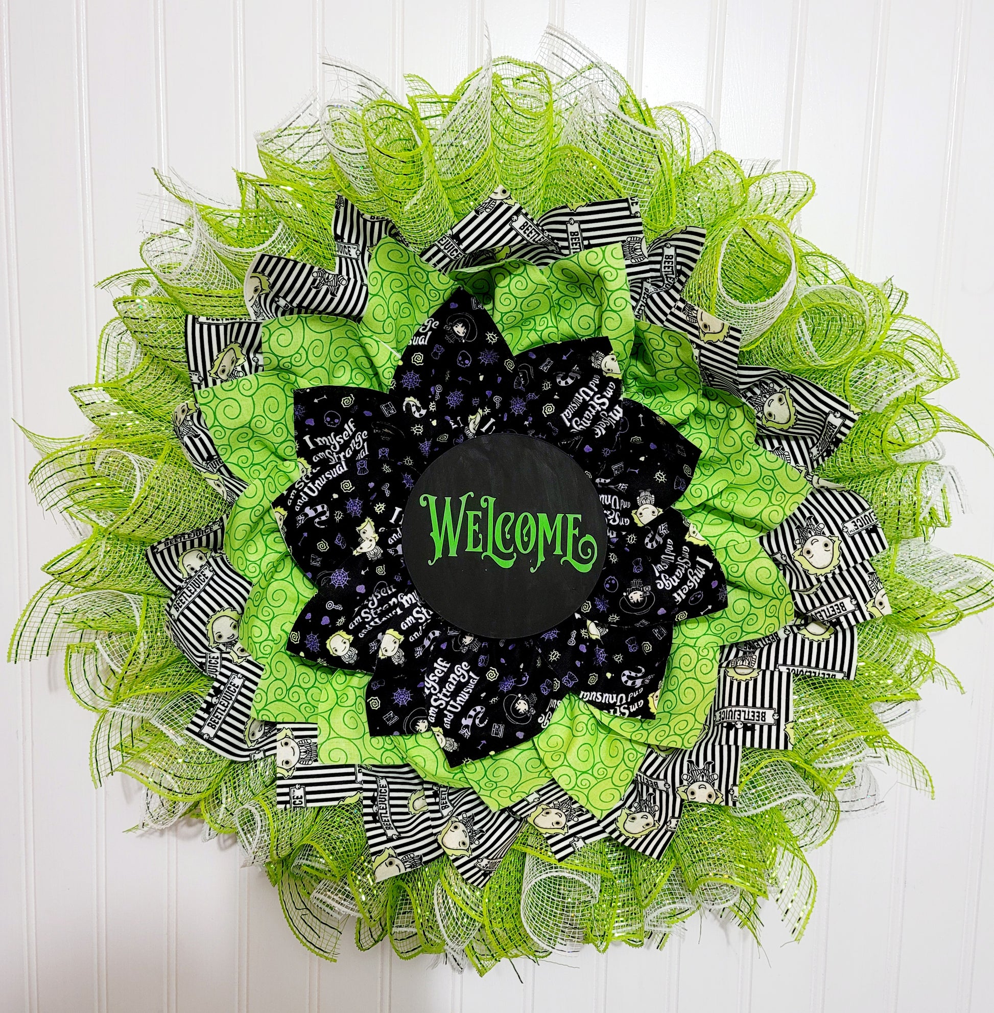 This is a handmade fabric wreath. This spooky masterpiece is 22 inches tall and wide.
