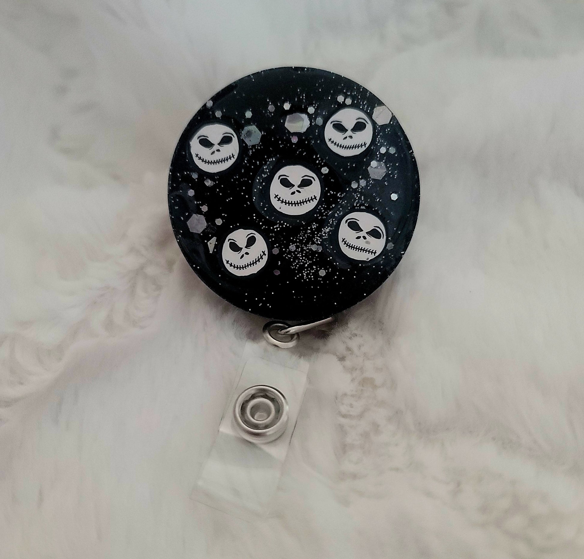 This is a handmade badge reel with a rotating claw clip.