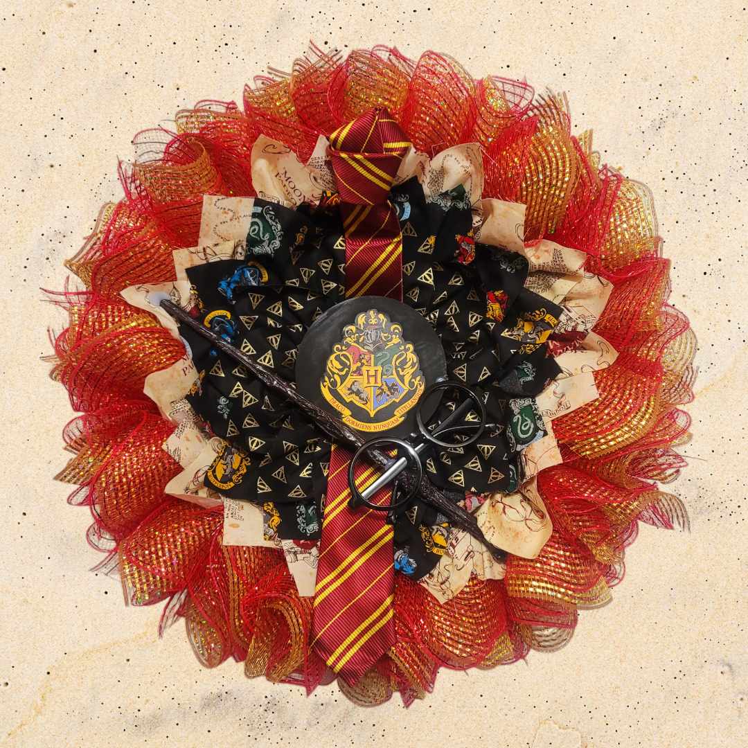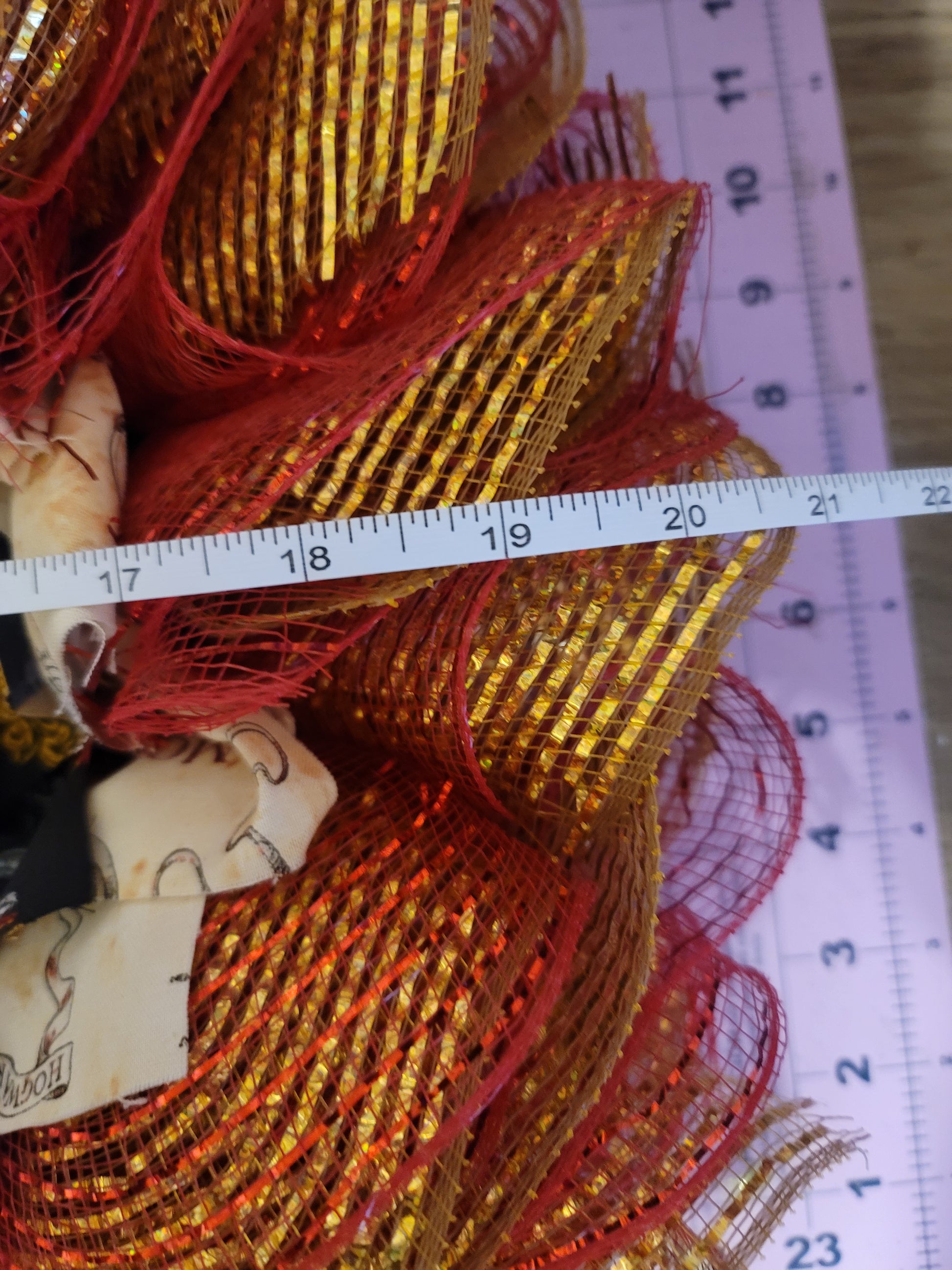 This is a handmade wreath. This is made from Cotten fabric that has been pressed, strategically measured and cut and pressed again. The Deco mesh is measured, cut and folded. And all the pieces are assembled together in a sturdy and durable manner. This is 22 inches wide as well as tall.