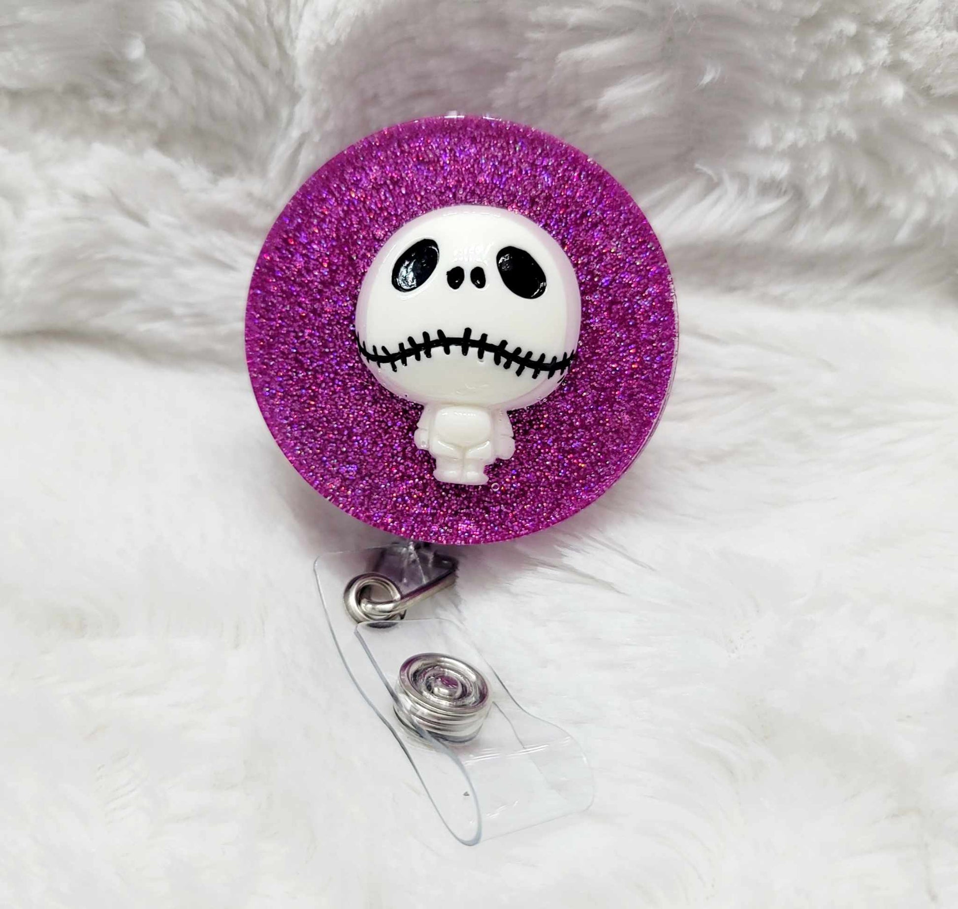 This is a handmade badge reel. This is a sparkly piece created for spooky season. This has a rotating claw clamp on the back.