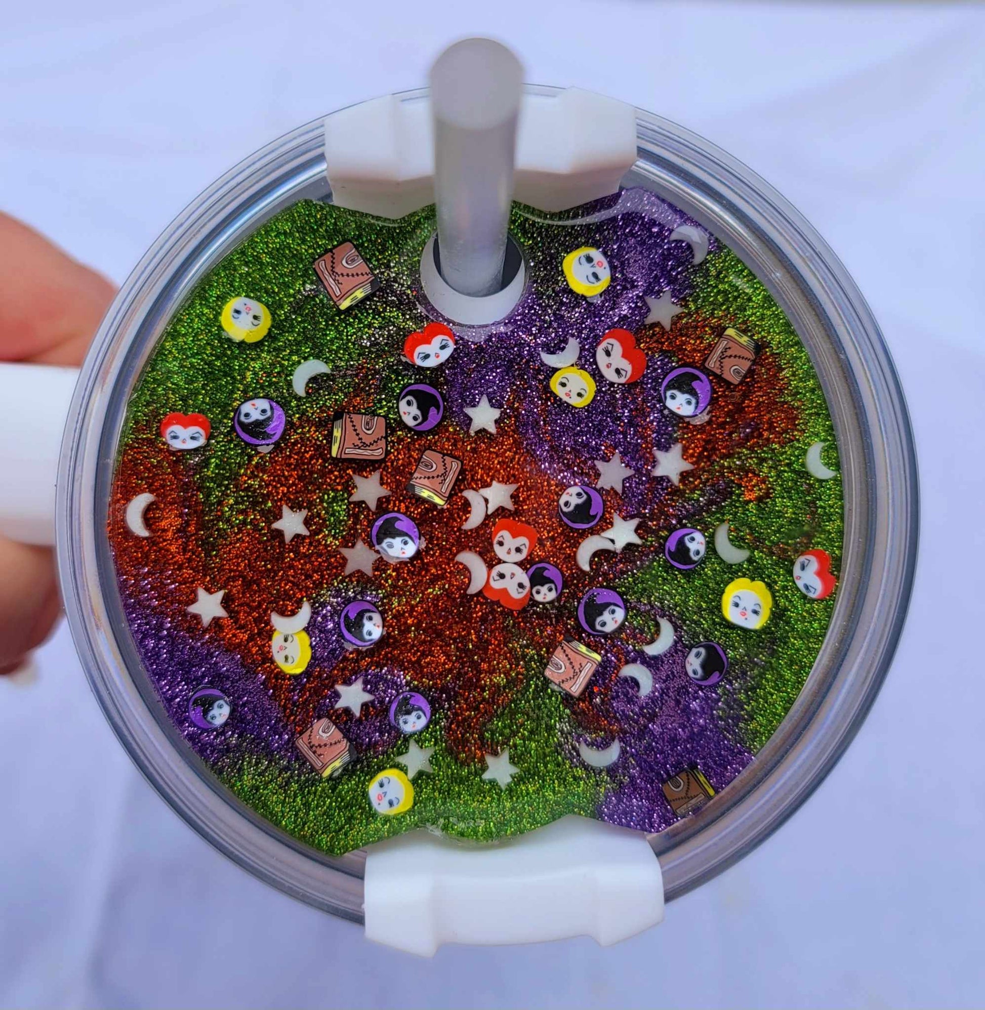 This is a handmade lid cover. This is a multi-colored cup topper created with spooky season in mind. This is made to specifically fit Stanley style tumblers.